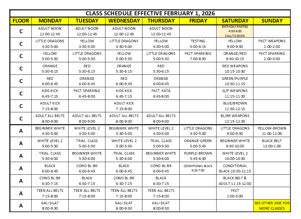 EFFECTIVE FEBRUARY 1, 2026 CLASSES FOR GREEN-BROWN BELTS HAVE CHANGES FOR TUESDAYS AND THURSDAYS. PLEASE SEE SCHEDULE BELOW.